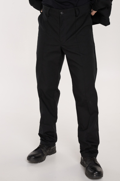 Брюки с застежкой молния + кнопка. Застроченные стрелки. Резинка в поясе по спинке.