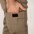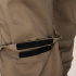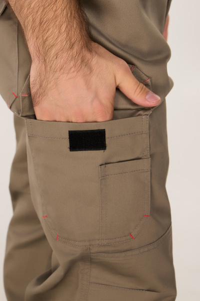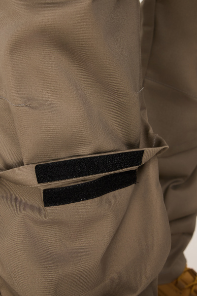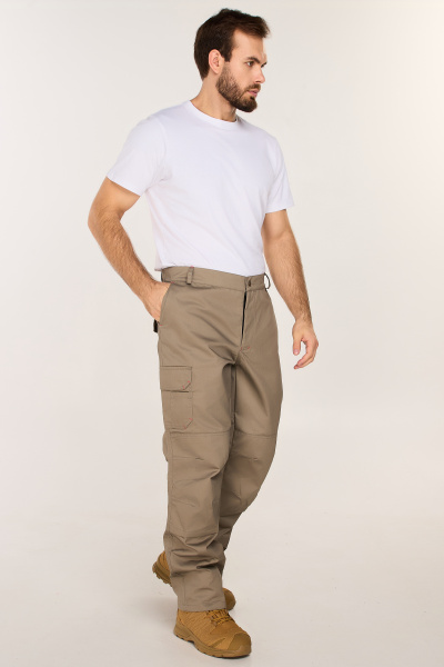Брюки прямого силуэта, задние половинки на фигурной кокетке. Резинка по поясу спинки. Шлевки под ремень. На правой половинке боковой и задний накладные карманы с клапанами на липучке. Для износостойкости на передних половинках наколенники из основной ткани с возможностью установки амортизационных вкладышей. Отстрочка в тон основной ткани. Декоративные закрепки контрастными нитками.