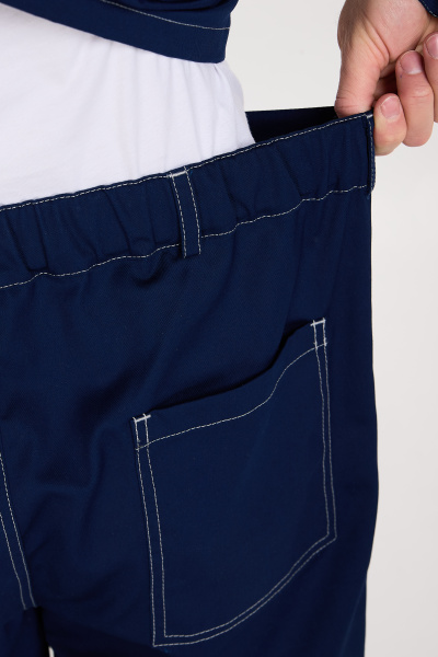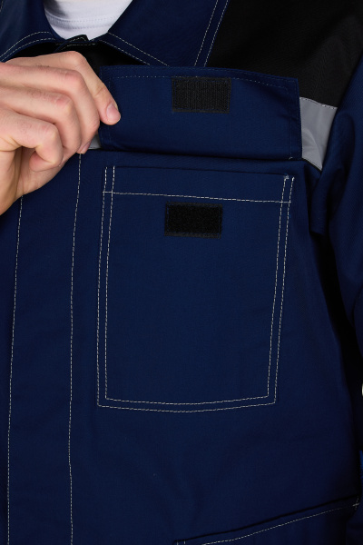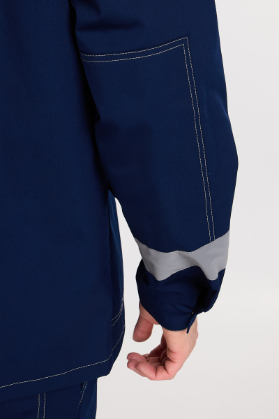 Удлиненная куртка. Скрытая застежка на пуговицы, накладные карманы, световозвращающая полоса 50мм, усиливающие накладки на локтях. Брюки с усиленными коленями, световозвращающей полосой 50 мм. Застежка молния + пуговица. Резинка в поясе по спинке.