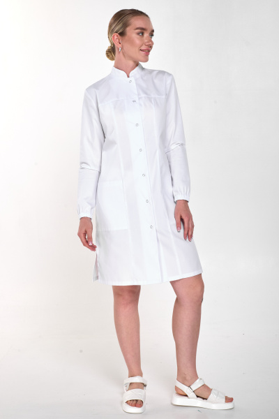 Халат женский ПРИЛЕГАЮЩЕГО СИЛУЭТА с длинными рукавами, центральной застежкой на потайные кнопки и воротником-стойкой.