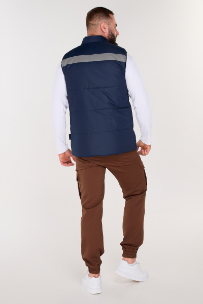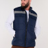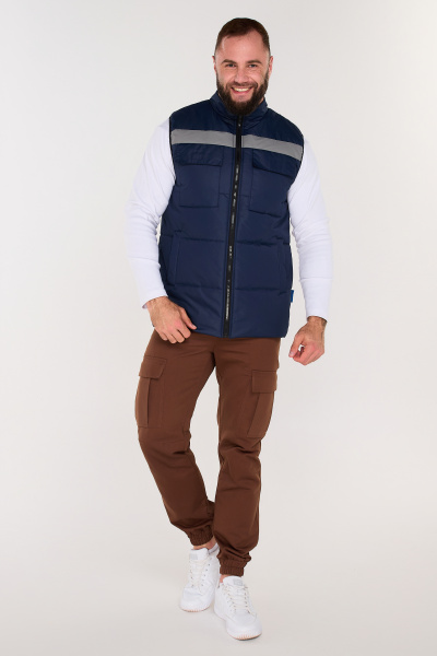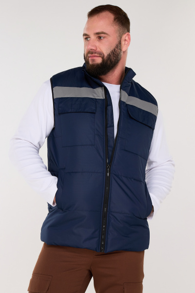 Жилет утепленный. Застежка на молнию-трактор. Нагрудные карманы с клапаном, прорезные карманы. Световозвращающая лента на полочке и спинке.