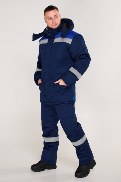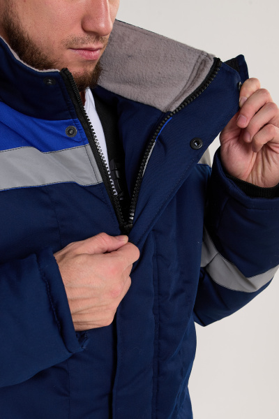 Накладные боковые карманы с клапанами (края клапана заходят в швы), два внутренних кармана. Рукава с внутренними трикотажными манжетами. На спинке, полочке (по кокеткам) и рукавах расположены световозвращающие элементы.