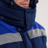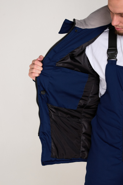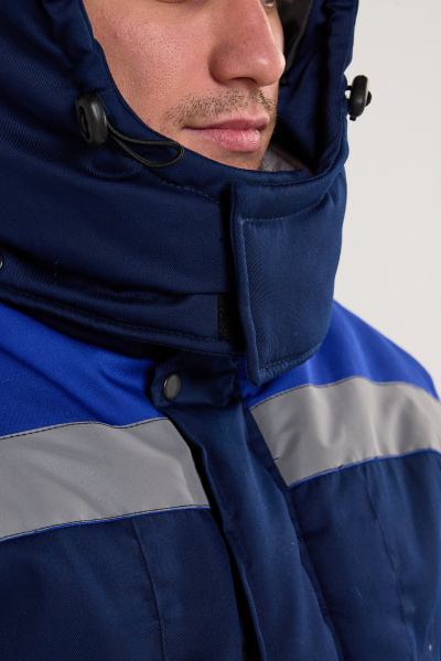 Воротник-стойка с внутренней частью из флиса. На съемном капюшоне предусмотрена возможность регулировки объёма по лицевому вырезу (кулиска с резиной и фиксаторами), обеспечивая защиту от ветра и осадков. Капюшон застегивается на липучку. По линии талии куртка регулируется по объёму благодаря кулиске с резиной и фиксаторами, обеспечивая дополнительную защиту от холода.